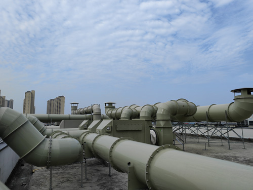 測試室有機廢氣 → 抗逆性炭脫水器 → 引軸流風扇 → 減排